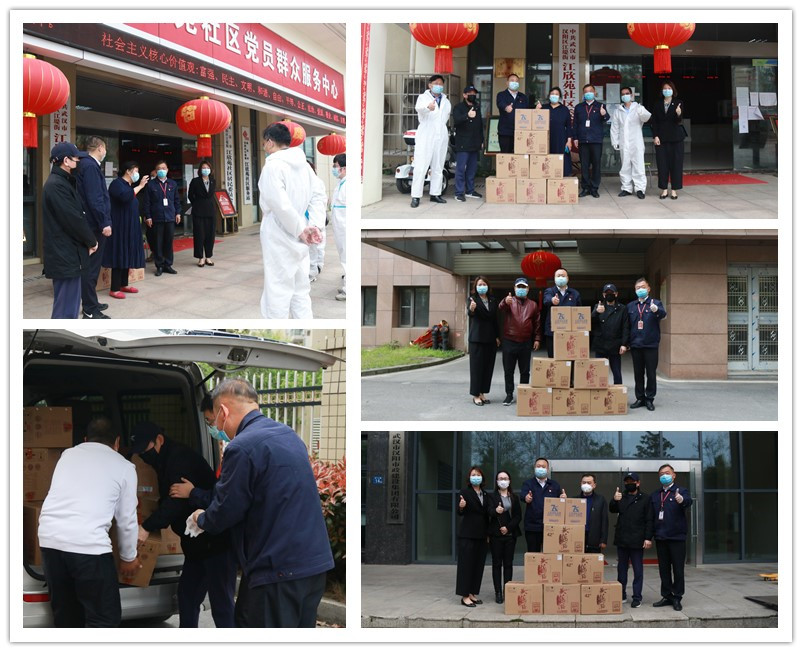3月24日,黃鶴樓酒業黨委書記、董事長許鵬,漢陽企業家協會主任耿旭東前往江欣苑社區、江騰集團和武漢市漢陽市政建設集團有限公司開展抗疫慰問活動,并捐贈近12萬元防疫物資。江欣苑社區黨委書記胡明榮、江騰集團董事長肖喜平、漢陽市政建設集團黨委書記、董事長嚴悌文代表各自單位接收物資。