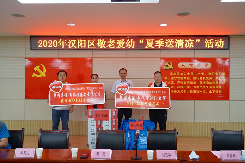 捐贈儀式上,劉漢華,趙亮為活動致辭,易喜祥、麻玉俠代表愛心企業作分享發言。黃鶴樓酒業和武漢市漢陽醫院分別向漢陽區敬老愛幼“夏季送清涼”活動捐贈300套防暑飲品和300套防暑藥品,劉漢華,趙亮代表社區困難群體接受捐贈。