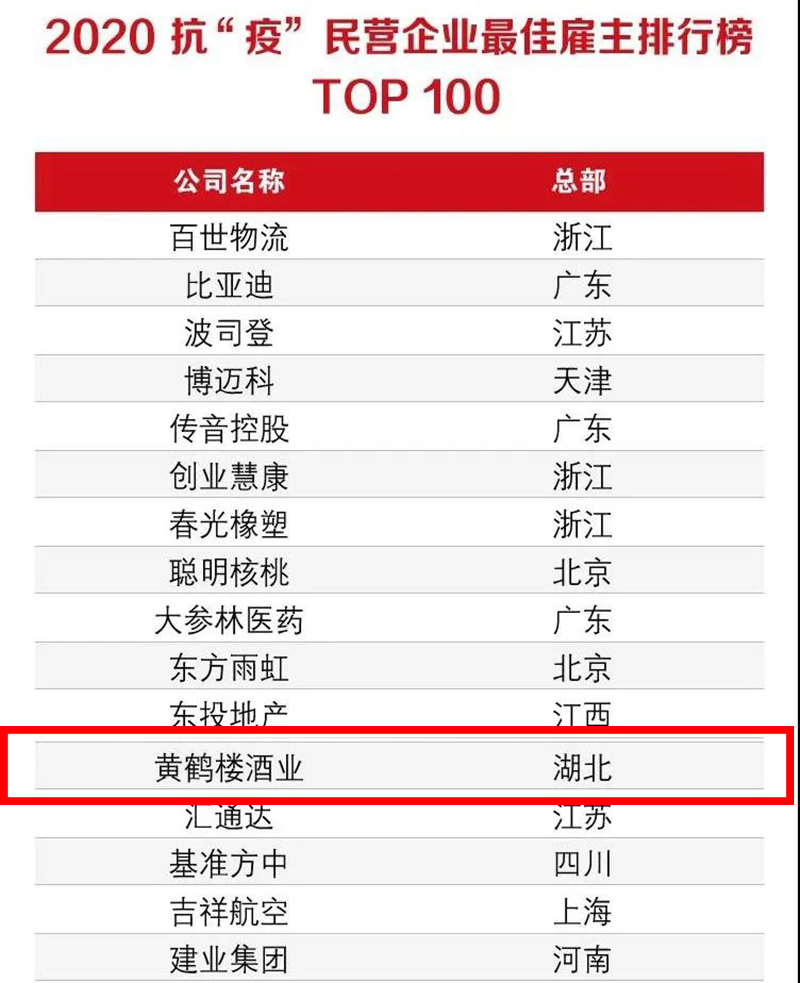 10月30日,胡潤百富、百富天啟和前程無憂三方聯合發布2020抗“疫”民營企業最佳雇主排行榜TOP100,黃鶴樓酒業名列其中,為湖北省唯一一家上榜企業。