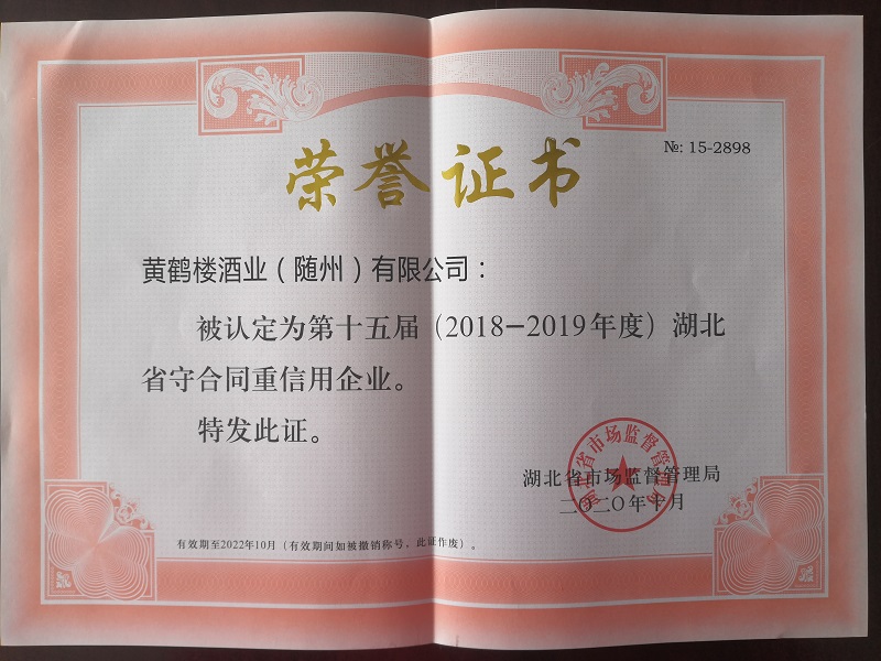 11月4日,隨州市市場監督管理局授予黃鶴樓酒業(隨州)有限公司隨州市第十屆“守合同重信用”企業榮譽稱號并發放證書,代授湖北省第十五屆“守合同重信用”企業榮譽證書。