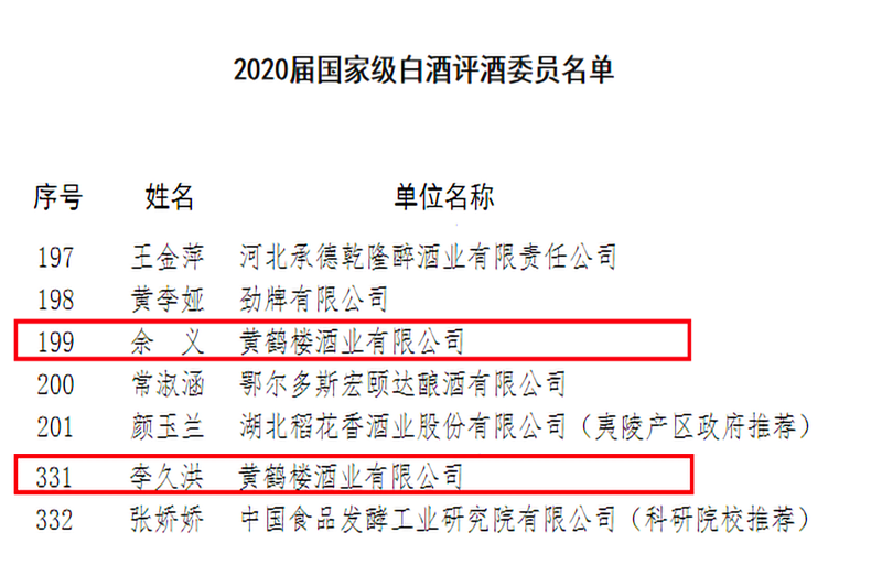 近日,第四屆全國白酒品酒職業技能競賽結果公布,黃鶴樓酒業李久洪、余義獲聘為中國酒業協會2020屆國家級白酒評酒委員。