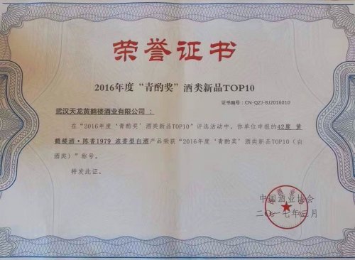 3月19日,在2017年中國國際酒業博覽會上,由中國酒業協會評定并頒發的2016年度酒類新品“青酌獎”正式揭曉,湖北中國名酒黃鶴樓酒戰略新品黃鶴樓酒?陳香,以更香、更柔、更順、更上層樓的中國名酒品質風范獲得中國酒業協會評委一致贊譽,斬獲“青酌獎”。