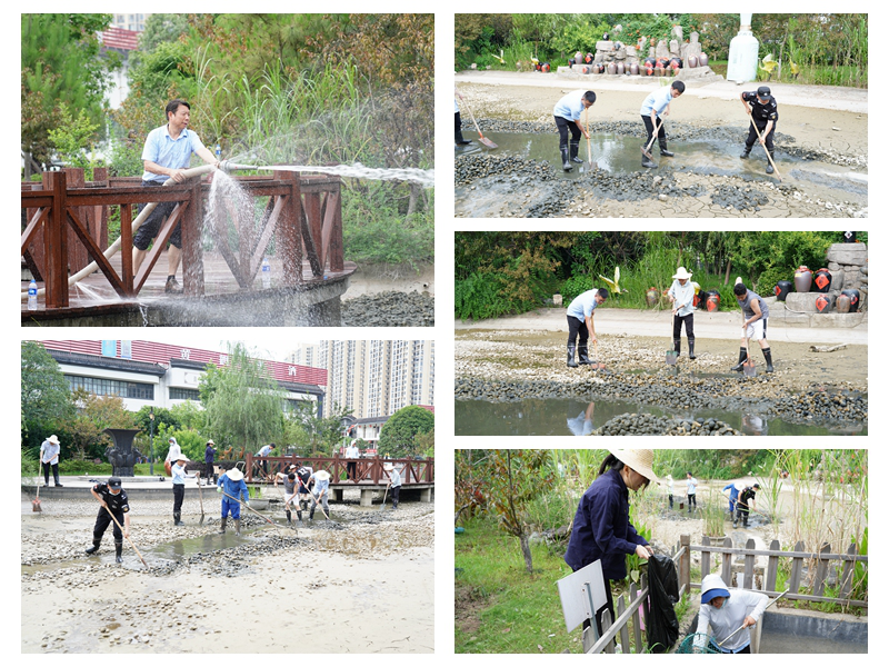 烈日下,大家換上膠鞋、手執鐵鍬走進小花園池塘,齊心協力、揚鍬鏟泥。兩個小時的勞作,眾人揮汗如雨、干勁滿滿,一鍬接一鍬將沉積花園池塘的淤泥徹底清理干凈。
