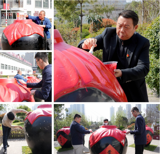 活動現場,行政黨支部黨員、發展對象、積極分子、團員對小花園、主干道等區域的酒壇進行重新上漆,大家團結協作、共同配合,有條不紊地進行調漆、打磨、清掃、涂刷等步驟,認真仔細地完成了酒壇刷漆工作,美化了廠區環境。